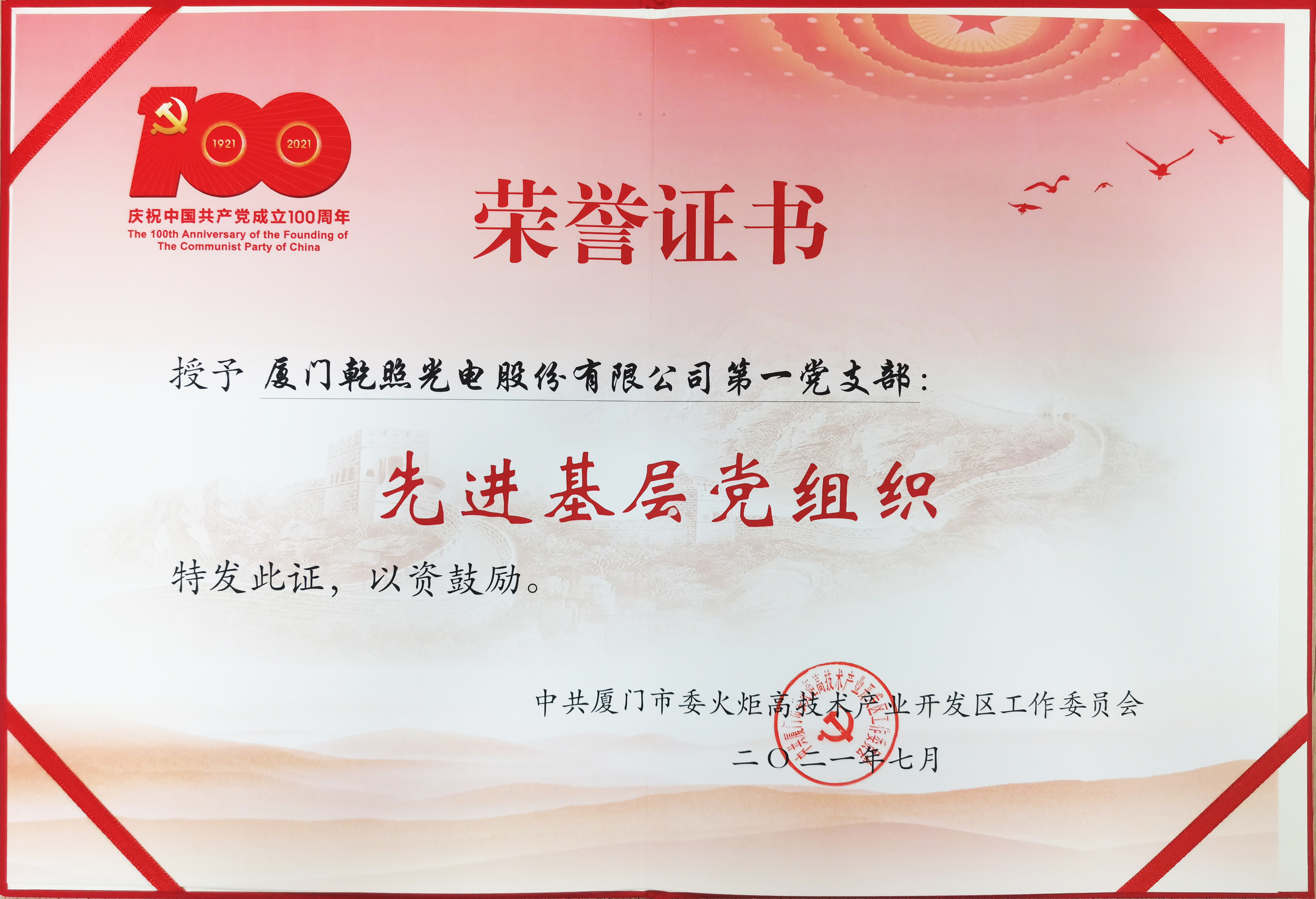 乾照光電黨總支榮獲“廈門市先進基層黨組織”稱號