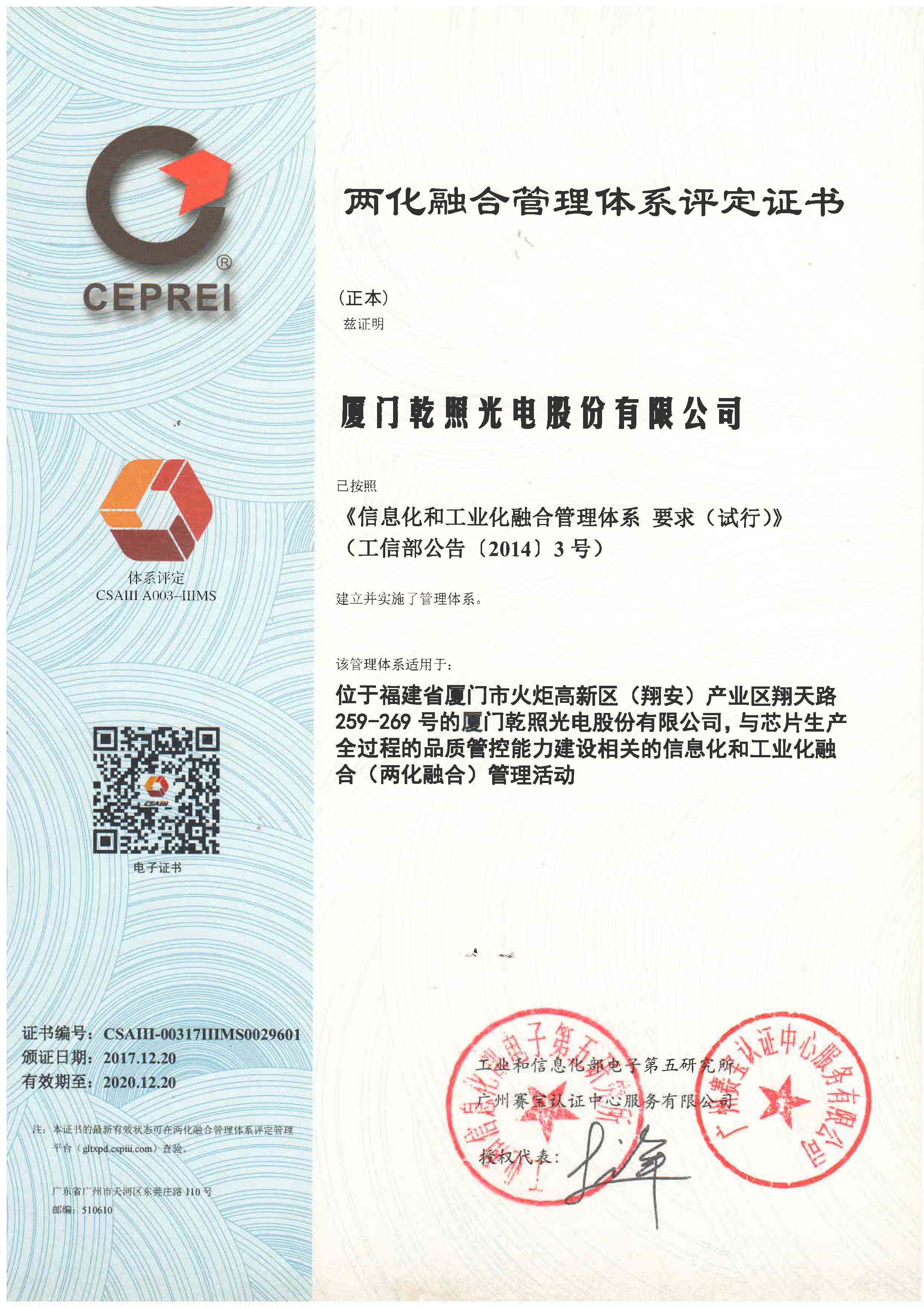 2017年12月20日,廈門乾照光電股份有限公司獲得兩化融合管理體系評定證書。這標志著乾照光電已建立起兩化融合管理體系,并在推進信息化和工業化深度融合方面取得顯著成效,在公司戰略轉型、組織變革、管理創新、技術融合和競爭力方面邁出堅實的一步。