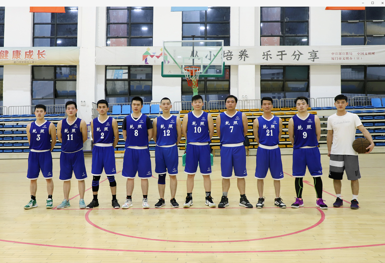 圖為籃球隊隊員合影,從左往右依次為劉偉文(芯片部)、肖遙(外延部)、陳帥城(整合部)、黃偉鵬(外延部)、曹衍燦(芯片部)、劉譽隆(芯片部)、魏振東(研發部)、盧泉柱(總裁辦)、林小強(采購部),右一為教練。