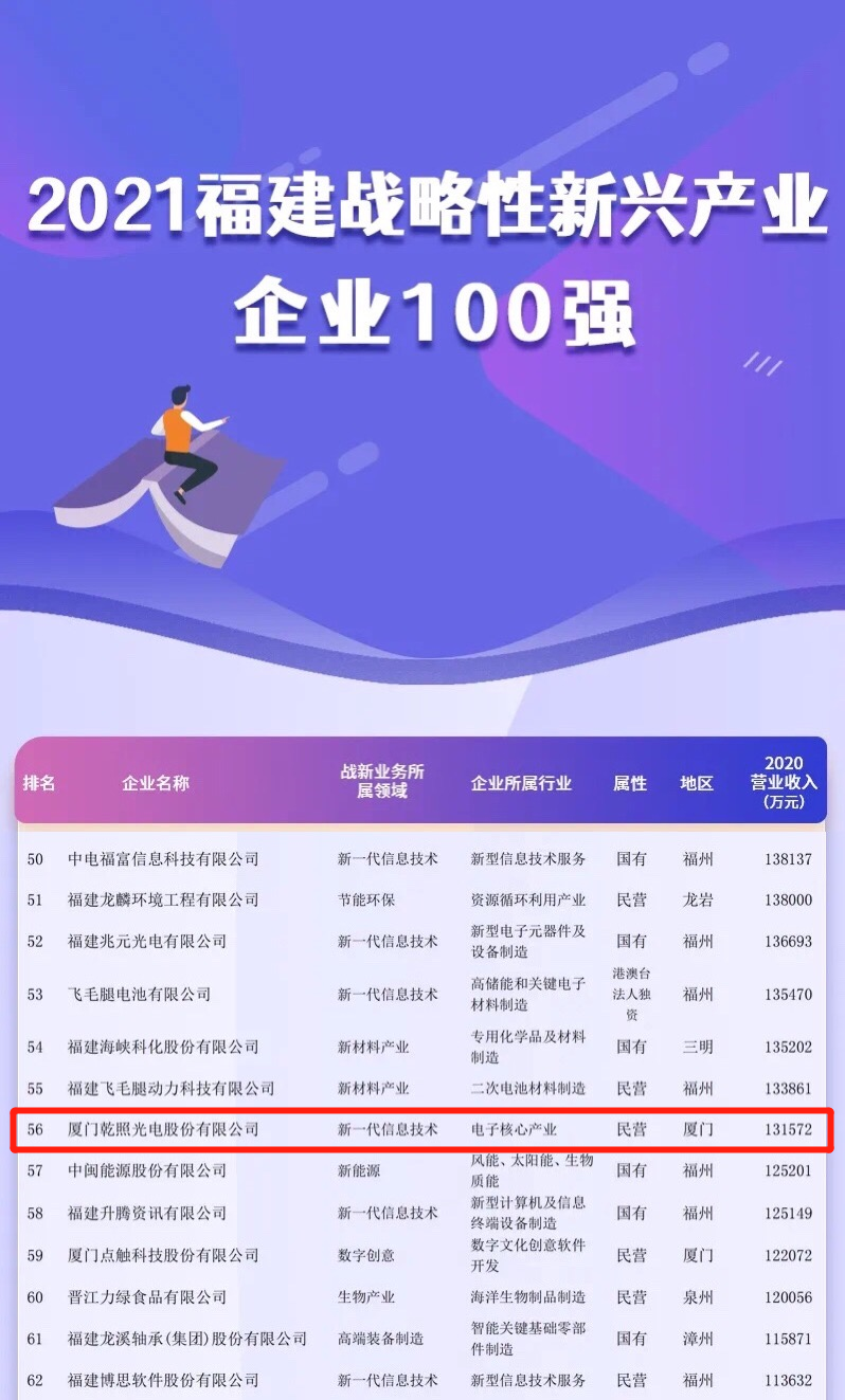 本次福建企業(yè)百強評選依照中國企業(yè)聯(lián)合會研究發(fā)布“中國企業(yè)500強”的做法要求,以2020年企業(yè)營業(yè)收入為基本標(biāo)準(zhǔn),綜合參考企業(yè)的其他經(jīng)營指標(biāo),經(jīng)評審委員會審定,廈門乾照光電股份有限公司以2020年營業(yè)收入131572萬元,入選 “2021福建戰(zhàn)略性新興產(chǎn)業(yè)企業(yè)100強”。