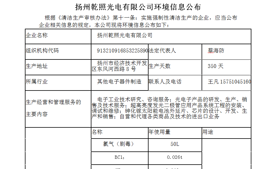 揚州乾照光電有限公司環境信息公布