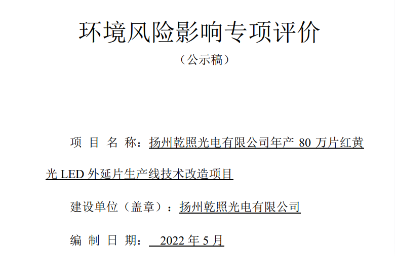 揚州乾照光電有限公司年產80萬片紅黃光LED外延片生產線技術改造項目環境風險影響專項評價公示稿