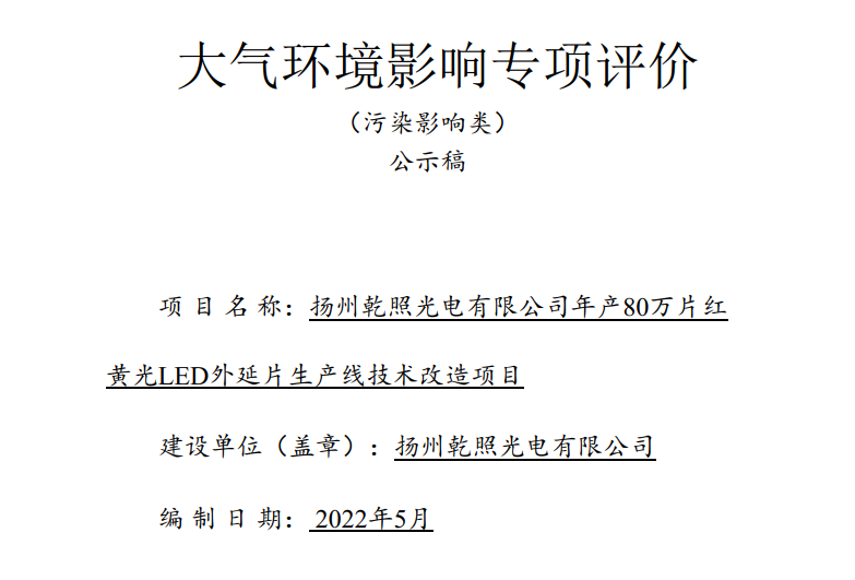 揚州乾照光電有限公司年產80萬片紅黃光LED外延片生產線技術改造項目大氣環境影響專項評價公示稿