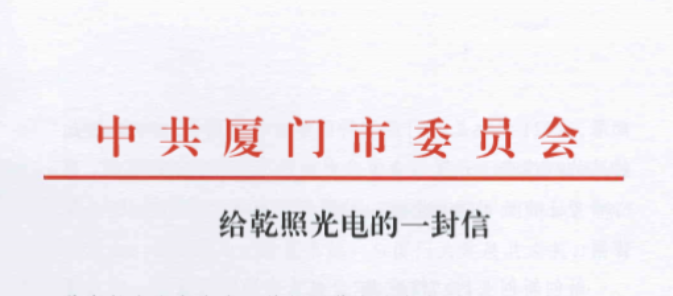 近日,乾照光電收到中共廈門市委員會的來信,信中廈門市委、市政府對于我司過去一年的發展給予了積極的評價,并在一元肇始之際,對我司表達了新年的祝福和誠摯的問候,同時就我司2021年的發展規劃做出重要指引。 “天...
